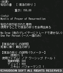 右クリックして秘技書を取ってみると、いきなり重量オーバー。 なんと、重さが150もあります。 拾ったら持ち帰らずにその場で使え、ということでしょうか? まぁ、レイジングを使えば持ち帰れるのですが。 持ち帰る意味はないので、その場で覚えましたけどね。 さて、触媒の調達です。 いちばん簡単なのはスパイダーシルク。ネオク高原には山ほどクモがいるので、手近なのを適当に倒せばすぐに手に入ります。 ブロンズインゴット、赤身魚の切り身、木の板材については、それぞれの職人さんの手によりすでに配布が始まっていたので、少しずつわけてもらいました。 いちばんの問題はほうれん草。 これがなんと、裁縫ギルド前のわずかな場所でしか採集できないらしい。そこにプレイヤーが集中して、ますます入手が難しくなります。 沸いたそばから刈られていくのですが、決定的に足りません。しばらく前のコットン畑のことを思い出します。 あたりに響く「ほうれん草ありませんか?」のOOC・・・。 うーん・・・。 ときどき、刈ったほうれん草をオープンセラーで0G配布してくれる方がいたので、何度かチャレンジしてGet。 これでようやくすべての材料がそろいました。 苦労して集めた材料を抱えてミシンのところへ。 コンバインウィンドウに放り込んでみると、メニュー欄に「ノアアーシップドール」が出現。 成功マスがどのくらいあるのかわからないのでドキドキしながらルーレットに入ると、スキル値は十分だったらしく、失敗マスは1つだけ。さくっと成功しました。 よかった・・・。ここで材料を無駄にしたら、かなりへこんだでしょうね。